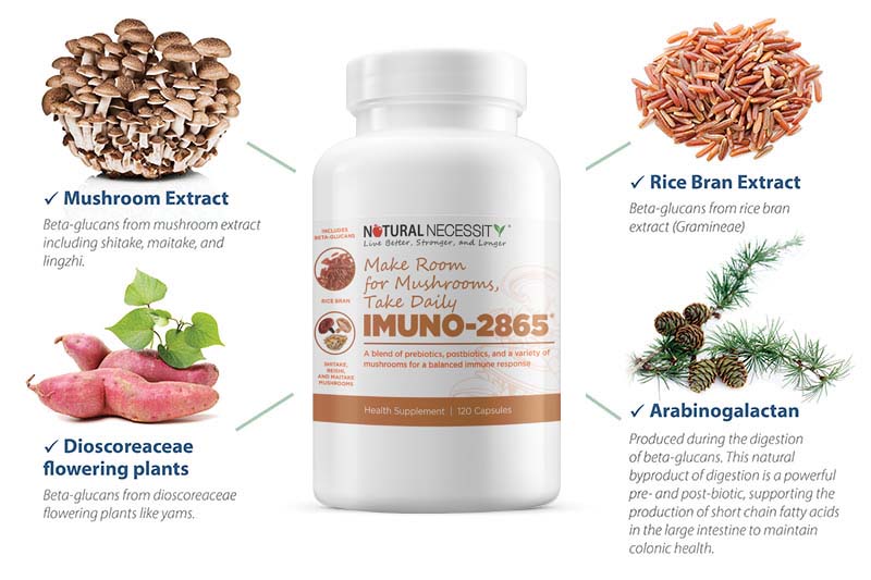 Imuno-2865® contiene una mezcla de origen natural de hemicelulosa y ácidos grasos que se extrajeron de hongos y cereal de salvado de arroz. Estos extractos brindan apoyo beta-glucano para un sistema inmunológico saludable todos los días, pero especialmente cuando el sistema inmunitario se enfrenta a desafíos como infecciones bacterianas o virales, contaminantes ambientales o estresores.